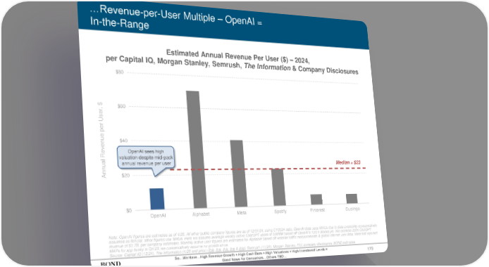 179 …Revenue-per-User Multiple – OpenAI = In-the-Range Note: OpenAI figures are estimates as of 4/25. All other public-company figures are as of 12/31/24, using CY2024 data. OpenAI data uses WAUs due to data availability (conservatively assumed as MAUs); other figures use MAUs. Here we assume average weekly active ChatGPT users of 300MM based off OpenAI’s 12/24 disclosure. We estimate 2024 ChatGPT revenue of $3.7B, per company estimates. Monthly active user figures are estimates for Alphabet based off website traffic measurements & global internet user data. Meta last reported MAPs for app family in Q4:23, we conservatively assume no growth since. Source: Capital IQ (12/24), The Information (4/25 and prior) (link, link, link, link & link), Semrush (11/24), Morgan Stanley, ITU, company disclosures, BOND estimates Annual Revenue per User, $ $0 $20 $40 $60 $80 OpenAI Alphabet Meta Spotify Pinterest Duolingo Median = $23 So…We Have…High Revenue Growth + High Cash Burn + High Valuations + High Investment Levels = Good News for Consumers…Others TBD… OpenAI sees high valuation despite mid-pack annual revenue per user Estimated Annual Revenue Per User ($) – 2024, per Capital IQ, Morgan Stanley, Semrush, The Information & Company Disclosures
