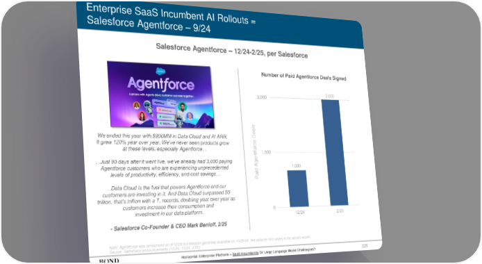 225 Enterprise SaaS Incumbent AI Rollouts = Salesforce Agentforce – 9/24 Note: Agentforce was announced on 9/12/24 but became generally available on 10/29/24. We assume zero users in the launch month. Source: Salesforce announcements (10/24, 12/24, 2/25) Salesforce Agentforce – 12/24-2/25, per Salesforce We ended this year with $900MM in Data Cloud and AI ARR. It grew 120% year over year. We've never seen products grow at these levels, especially Agentforce… …Just 90 days after it went live, we've already had 3,000 paying Agentforce customers who are experiencing unprecedented levels of productivity, efficiency, and cost savings… …Data Cloud is the fuel that powers Agentforce and our customers are investing in it. And Data Cloud surpassed 50 trillion, that's trillion with a T, records, doubling year over year as customers increase their consumption and investment in our data platform. - Salesforce Co-Founder & CEO Mark Benioff, 2/25 Paid Agentforce Deals Number of Paid Agentforce Deals Signed Horizontal Enterprise Platform = SaaS Incumbents Or Large Language Model Challengers? 1,000 3,000 0 1,500 3,000 12/24 2/25